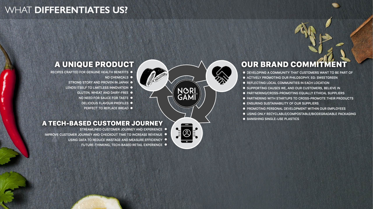Although the UK grab-and-go market is booming, it’s saturated with processed, bread-based, and nutritionally weak options. Food intolerances are rising, and consumers are demanding more innovation, transparency, and authenticity — but few players deliver. Norigami needed a compelling story and clear value proposition to stand out and resonate with purpose-driven investors.