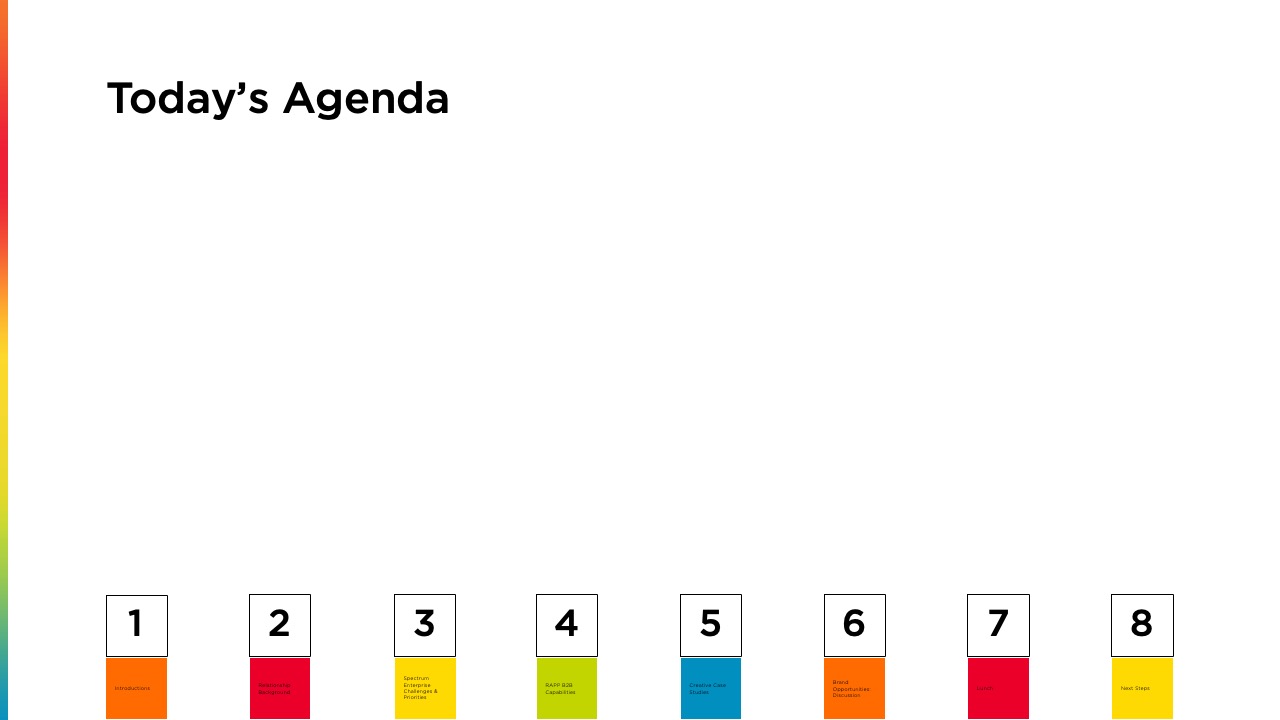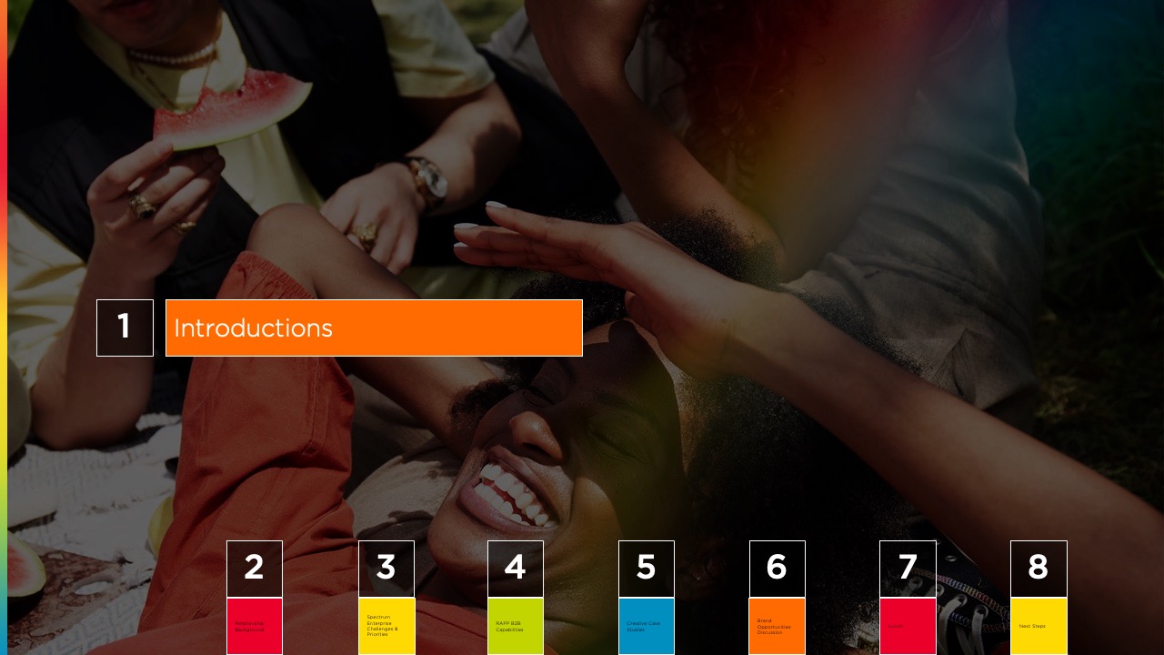 Design an immersive, branded deck to guide a multi-agency workshop, clarify Spectrum Enterprise’s brand journey and goals, and visualize a roadmap for creative collaboration with RAPP.