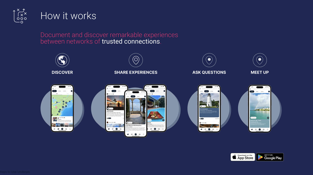 Underpin, a social platform for travel recommendations, brought me in to design a polished pitch deck that clearly showcased their vision and monetization strategy.